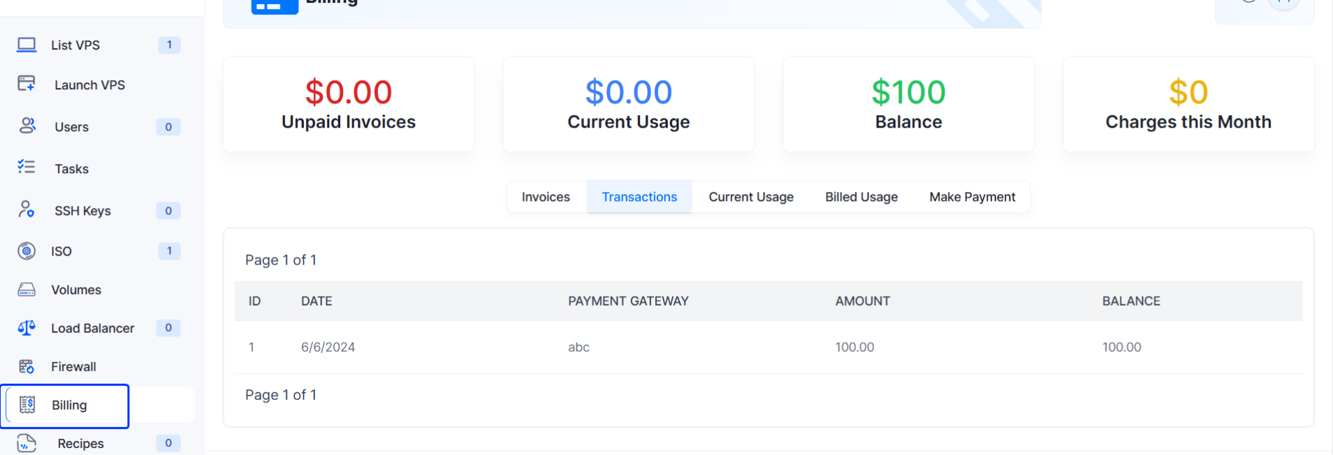 cloud panel will show the Billing menu on the Left menu section as shown below.
