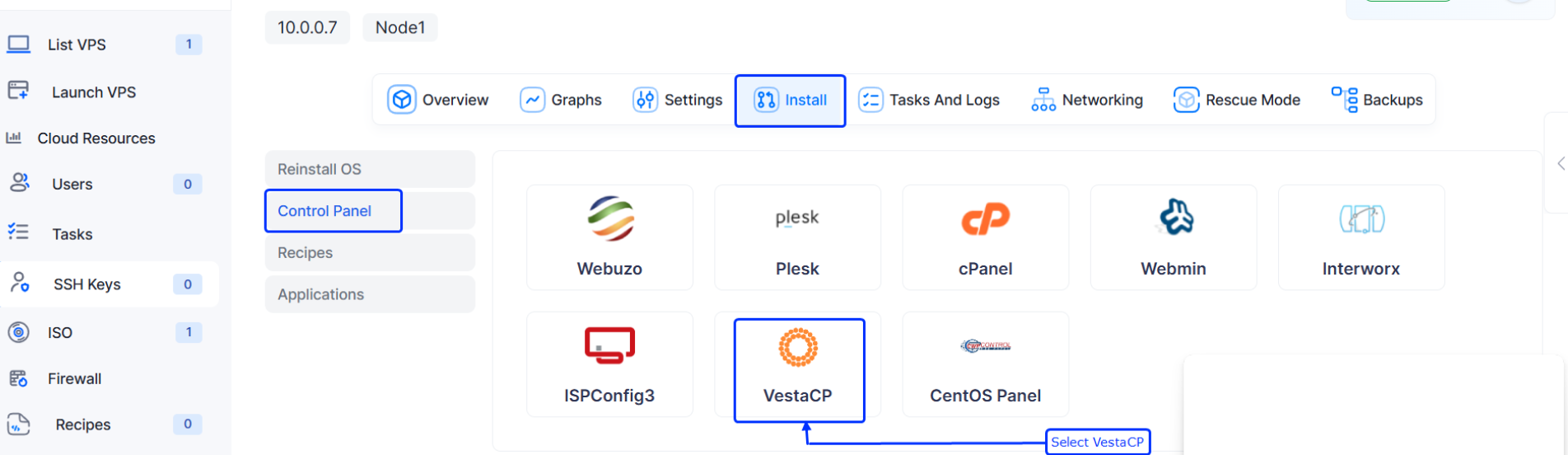 Login to Virtualizor Enduser panel -> Select the VM on which you want to install the control panel -> Click on the Install tab -> Click on the Control Panel button. You will get a screen as shown below where you can see the VestaCP icon for selection. After selection is done it will ask for a confirmation, an alert will be shown, click on Yes to begin installation.