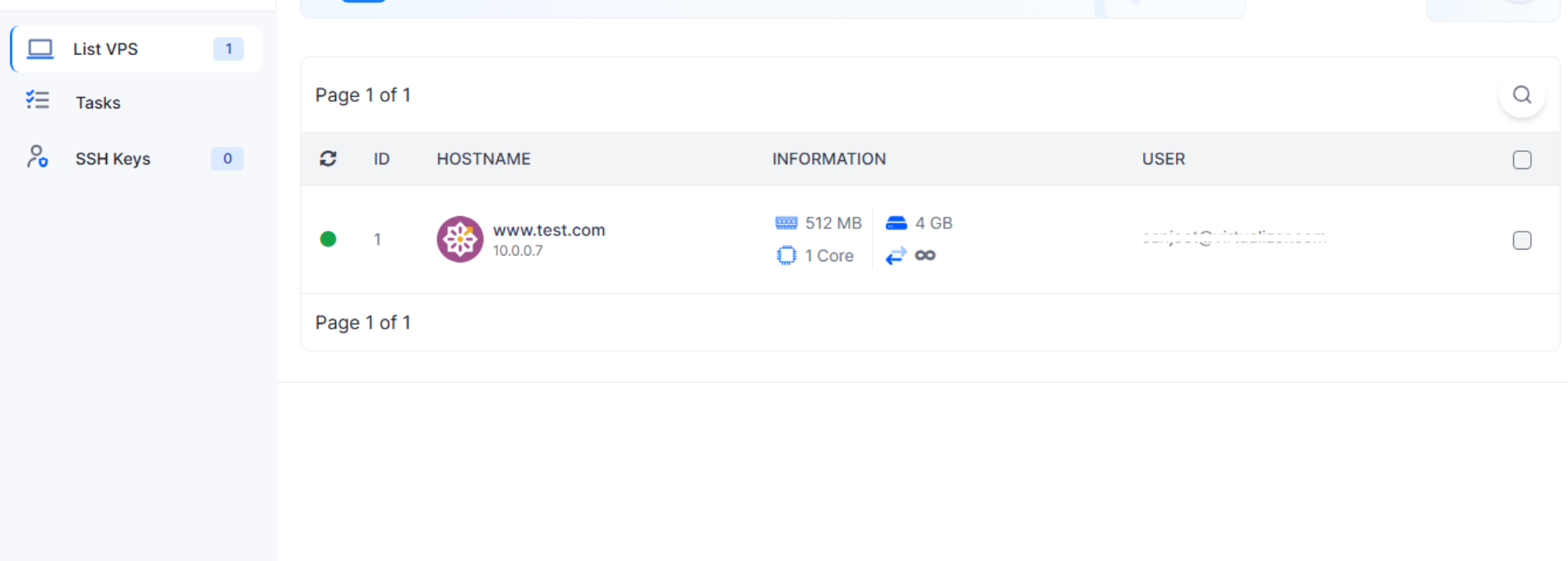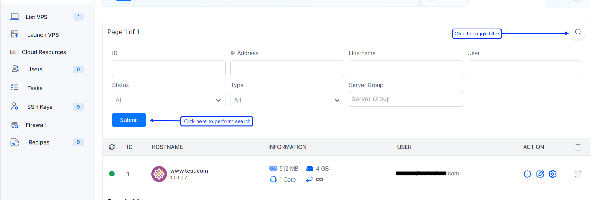 This page displays all the VPS(s) of the user. user can perform various task on the VPS(s) from this page.