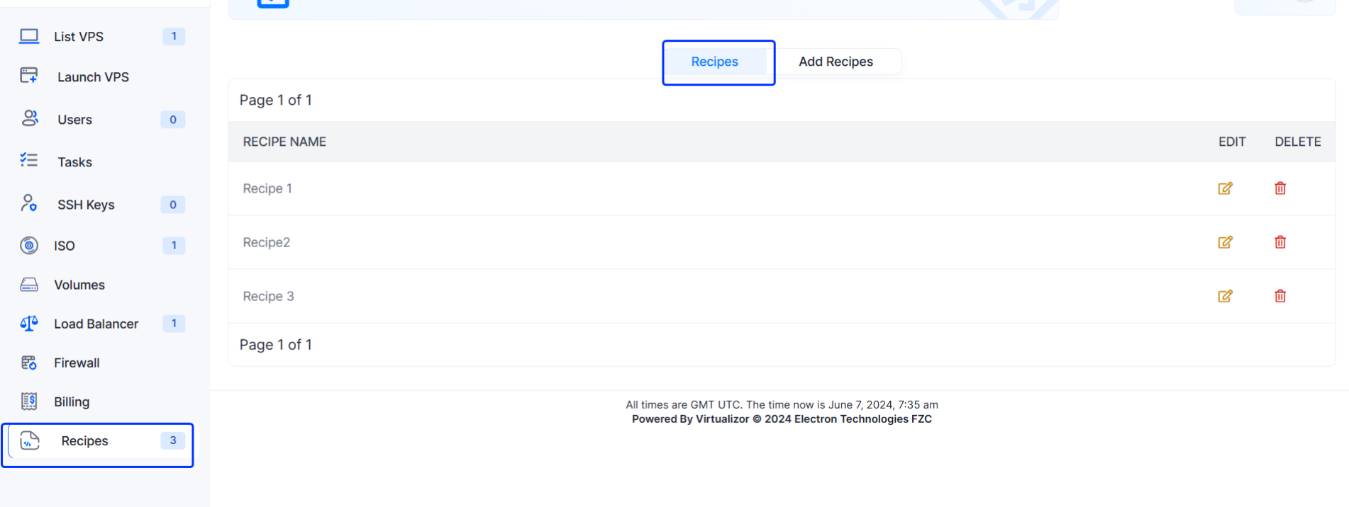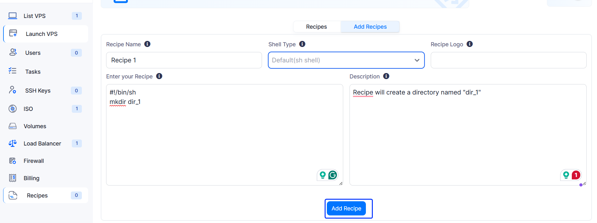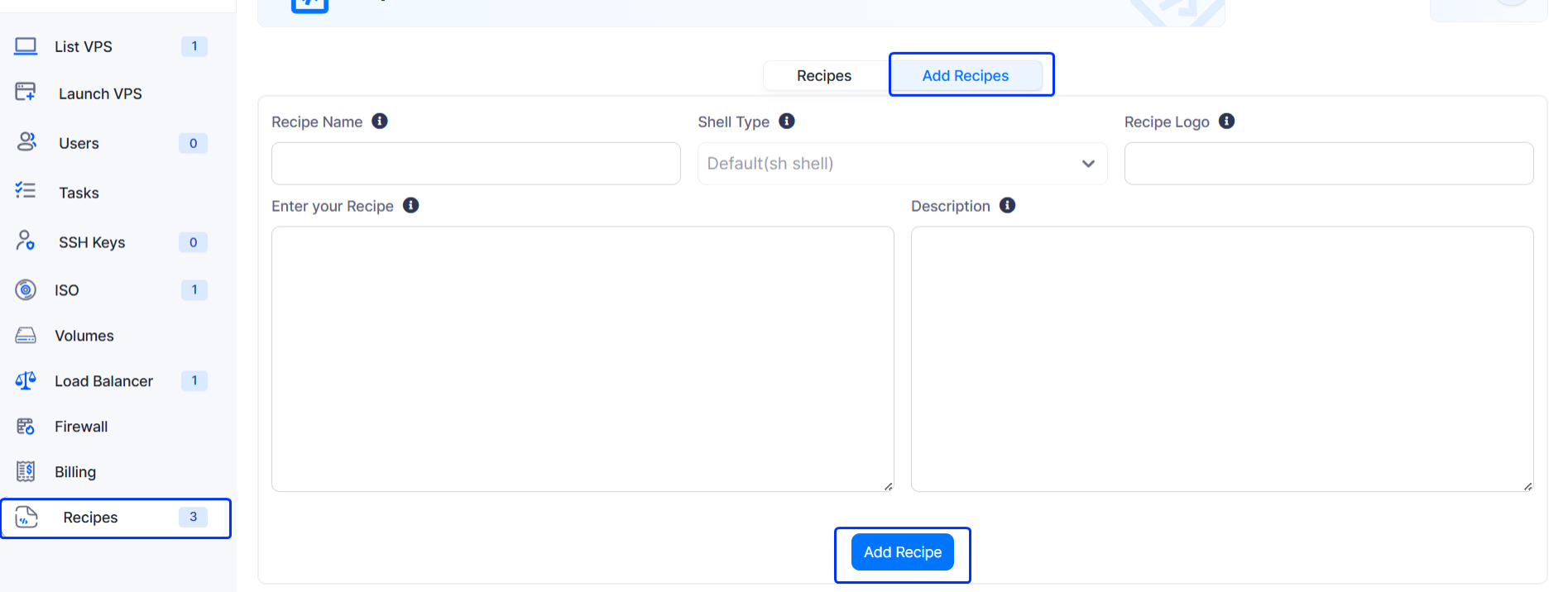 To add recipes go to Virtualizor Enduser Panel -> Recipes -> Add Recipes.