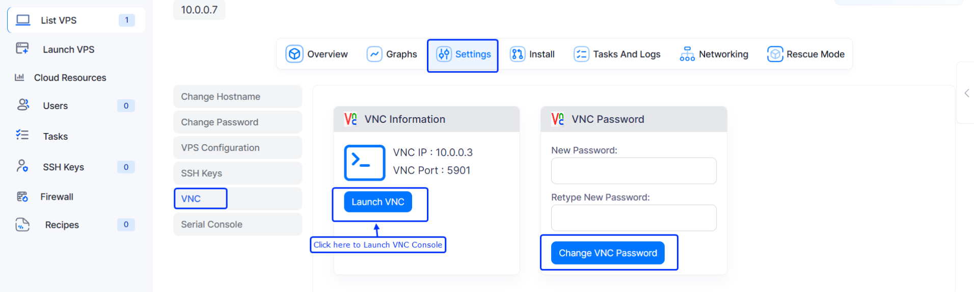 DelaOne provides VNC Viewer using which you can access your VPS. It is very easy to use this feature on DelaOne. All you have to do is switch on the VPS, click on the VNC icon in the vps management page and click the "Launch HTML 5 VNC Client" button.