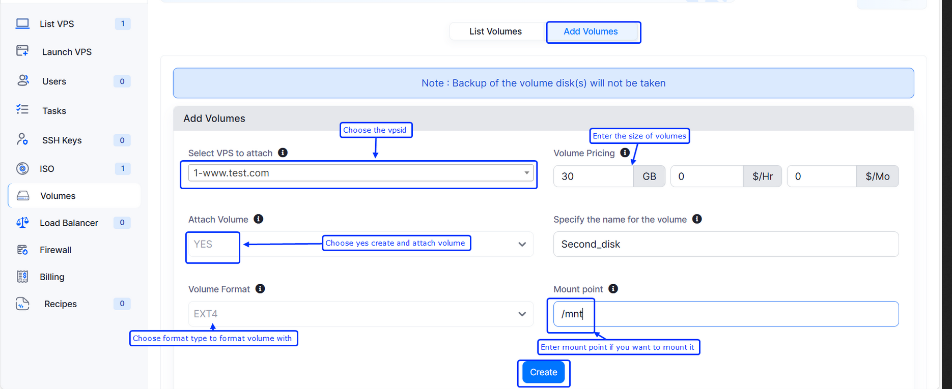 NOTE : The volume will be mounted only if guestagent is installed in the vps.