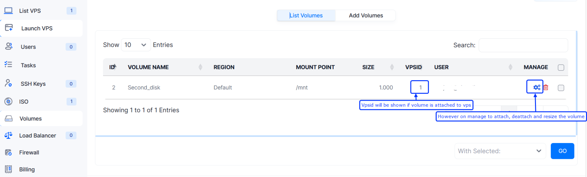 NOTE : volume can only be deleted and resized only if it not attached to vps.