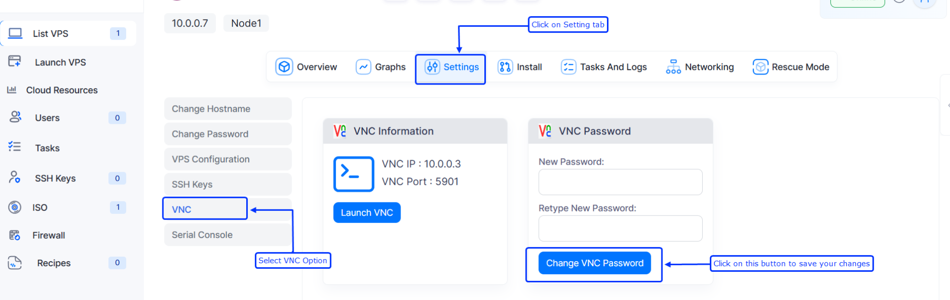 Go to VPS Management Page, click on "VNC Password". To change your VNC Password, enter your new password and again retype the same new password for confirmation and then click on "Change VNC Password". Your VNC Password will be changed successfully.